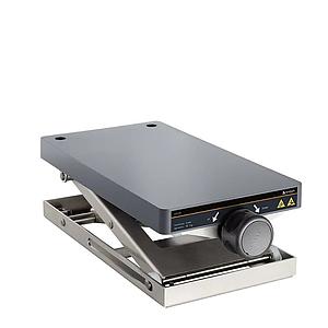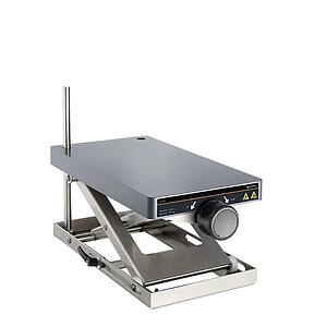 Az állítható lapnak (190 mm x 400 mm) köszönhetően a mágneses keverő nem imbolyog és nem csúszkál. Egy kézi működtetésű csörlő és egy tartórudakhoz való rögzítő is tartozik a laboratóriumi emelőhöz a berendezései biztonságosan rögzítéséhez. A magasság 100 mm-től 275 mm-ig állítható, ami egy 175 mm-es tartományban történő függőleges emelésnek felel meg.